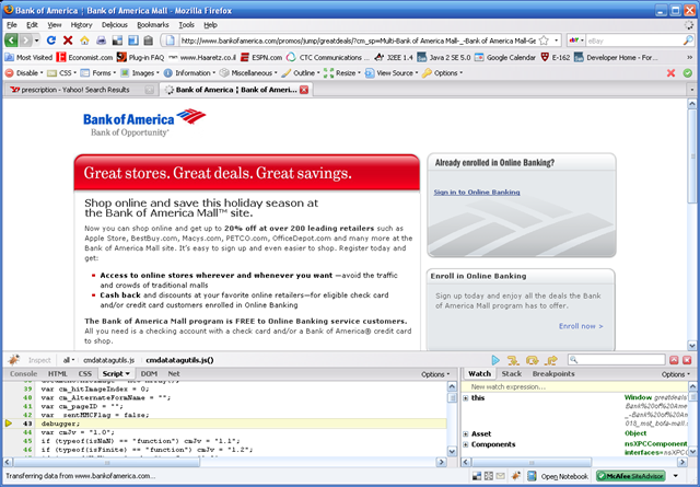 This is why Bank Of America developers should check their code before it gets into production… Someone was smart enough to leave a debugging instruction (debugger;) which causes Firebug to start. Oopsie. Looks mighty professional…